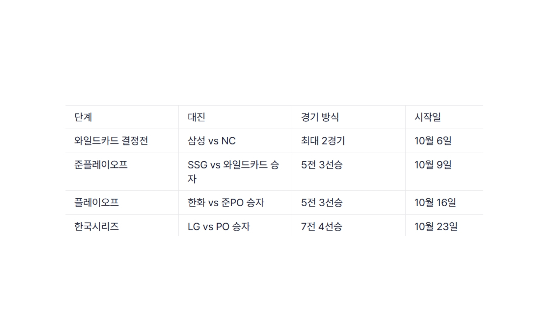 준플레이오프는 3위 SSG와 와일드카드 결정전 승자의 대결로 진행됩니다. 이어서 플레이오프에서는 2위 한화가 준플레이오프 승자를 기다리고 있어요. 최종적으로 한국시리즈에서는 1위 LG가 플레이오프 승자와 맞붙게 됩니다.